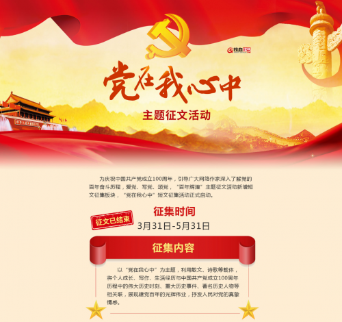 为庆祝中国共产党成立100周年,引导广大网络作家深入了解党的百年奋斗历程,爱党、写党、颂党,铁血网在启动“百年辉煌”主题征文活动中新增短篇征集板块——“党在我心中”征文。