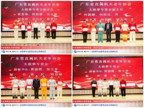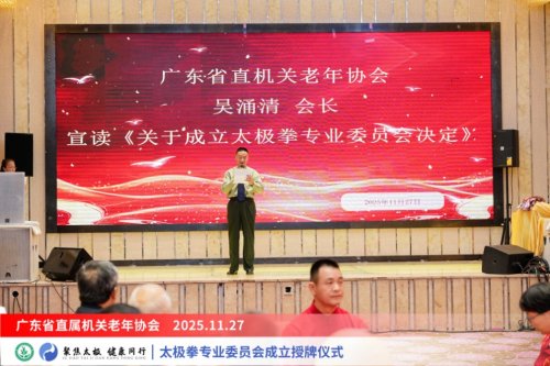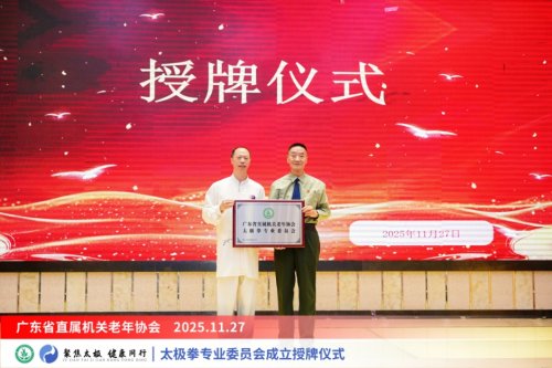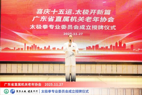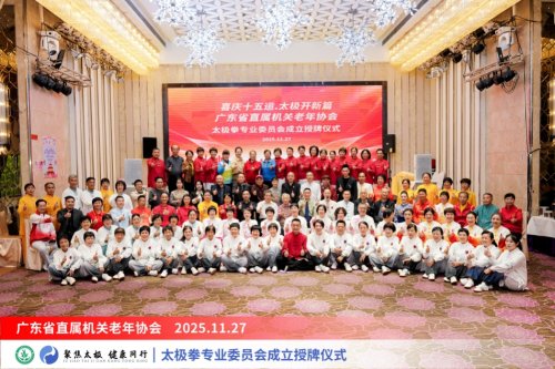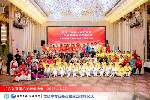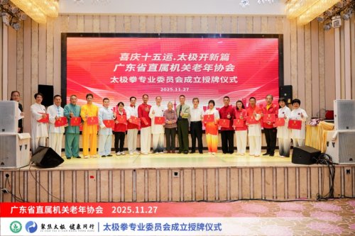 2025年11月27日,广东省直属机关老年协会太极拳专业委员会(以下简称“太极拳专委会”)成立授牌仪式在穗隆重举行。此举标志着省直机关老年太极拳运动迈向组织化、专业化发展的新阶段,为丰富老年朋友精神文化生活、推广中华优秀传统文化搭建了重要平台。
