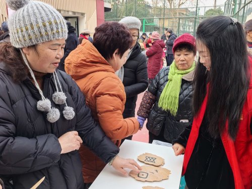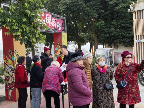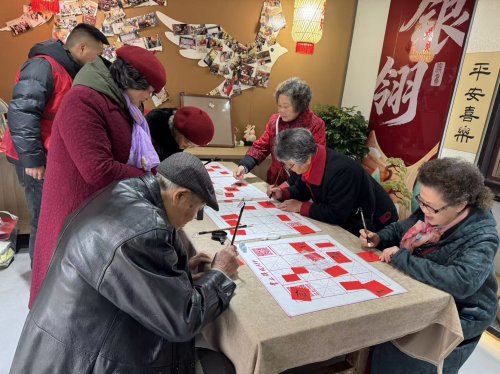 活动现场,锦江球局化身充满温情的文化空间,二十余位“候鸟”长者齐聚一堂。在“集百福”签到环节,大家挥毫写下的“福”字拼贴成寓意团圆的“百福图”,成为五湖四海“候鸟”扎根社区的生动写照;“银龄辨甲骨”趣味互动与新春书画创作环节,让长者们在笔墨交流中分享家乡习俗、切磋技艺,原本陌生的邻里渐渐熟络;最后的“新春送福”仪式上,一幅幅春联与画作在“候鸟”人群、社区与景区商家间传递,让文化成为连接本土与外来群体的情感纽带。