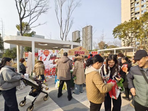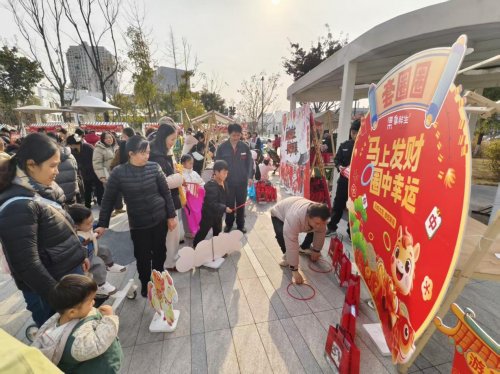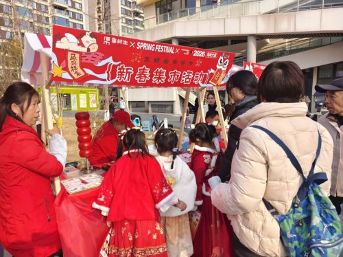 文艺汇演结束后,由五根松社区集生鲜邻里中心组织的幸福集市开始,现场有冰糖葫芦、糖画、套圈、中医义诊等众多颇具年味的摊位,居民们领取了游园券,开始在各个摊位排队参与体验,整个现场十分热闹。