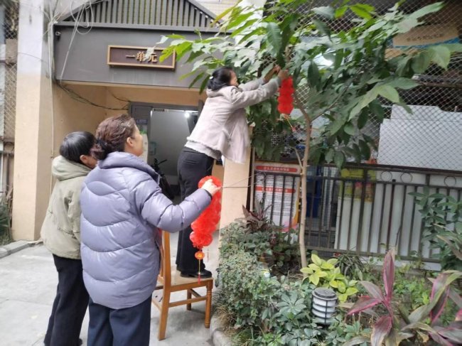 另一边,3名志愿者组成的装扮组也忙碌起来。他们在小区主干道两侧的树木以及公共活动区域,有条不紊地开展节日装扮工作。志愿者们分工协作,严格遵守安全规范,在确保不影响居民通行和公共设施正常使用的前提下,将一个个红红的小灯笼牢固且美观地悬挂起来。随着灯笼的陆续挂好,原本略显平淡的小区瞬间焕发出浓浓的新春气息。红红的灯笼在微风中轻轻摇曳,仿佛在向每一位居民传递着新春的祝福,让大家提前沉浸在过年的喜悦之中。