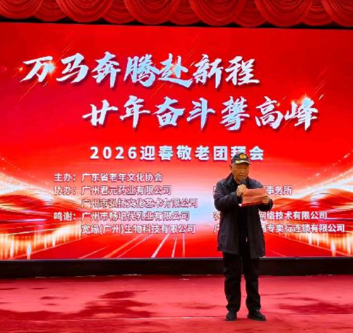 2月2日上午,广州流花宾馆凯悦厅张灯结彩,喜庆洋溢。广东省老年文化协会以“万马奔腾赴新程,廿年奋斗攀高峰”为主题举办一年一度团拜会,广东省人大原常委会副主席佀志广、广州市原副市长陈绮绮等领导及社会各界人士、协会工作人员、演员240多人欢聚一堂,喜迎马年的到来。广东省老年文化会长刘利光在致辞中说,一年来协会及各分会开展与举办了各种公益活动和文体活动二百余场,参加团队分队达300多支。协会还承办了有广州市老干部大学、广州老年国际用品博览会等单位主办的广州市首届银龄艺术季的赛事,主办了重阳节敬老登山活动。会上,协会还为支持工作的企业颁发了爱心牌匾。随后优秀团队表演了独唱、对唱、舞蹈、京剧、柔力球等丰富多彩的文艺节目,把团拜会喜庆的气氛推向了高潮。